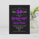 50º Convite de aniversário. Design preto, roxo e branco elegante com padrão de quadro de referência e fonte de script. Saúde a 50 anos! Envie-me uma mensagem se precisar de mais personalização.