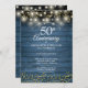 Com belas luzes de corda e confetes delicados de corações de amor dourados sobre um fundo de painéis de madeira rústica azul. Personalize com as informações do seu aniversário de cinquenta anos em letras elegantes. Criado por Thisisnotme©