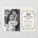 Convite de 50º Aniversário de Casamento com Foto. Design elegante em branco com falso ouro brilhante. Apresenta rosas brancas, fonte manuscrita e confetes. Perfeito para uma celebração sofisticada. Pode ser personalizado para qualquer ano! Mensagem-me se precisar de mais personalização.