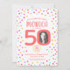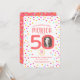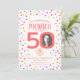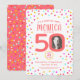 Confetes coloridos e alegres com pontos aleatórios, convites de festa surpresa de 50 anos. Em coral vivo brilhante, rosa quente, amarelo dourado e azul aqua verde. Adicione a foto da aniversariante no centro do 0 em 50 e personalize com a data de aniversário de cinquenta anos, horário e detalhes da festa. Coral vivo com pontos aleatórios por todo o padrão no verso. Outros itens correspondentes e anos de aniversário marcantes disponíveis. Design original por www.mylittleeden.com no zazzle.