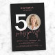 50.º Convite de Aniversário, Cor-de-Rosa Negra Moderna. Marque seu marco em estilo com este design moderno e simples, acentuado com toques suaves de rosa para um olhar sofisticado. Adicione sua foto personalizada para criar uma peça personalizada que reflita perfeitamente sua celebração. O layout minimalista garante que seu momento especial ganhe palco central enquanto mantém um apelo para o eterno. Ideal para convites, guardas, ou decoração partidária, esta design combina elegância com um toque pessoal, fazer-a perfeita para celebrar os marcos da vida com calor e charme.
