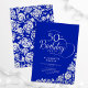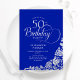 Simples e elegante convite de aniversário 50º em azul real e prata. Design clássico com rosas, folha prateada falsa e letra de script de tipografia. A Trendy convida o cartão perfeito para uma festa de na moda. Personalize com seus próprios detalhes. Pode ser personalizado para qualquer idade. Impressos convites Zazzle ou modelo de impressão digital instantânea para download.