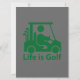 Você pode personalizar todo o texto deste convite de aniversário de 50º golfe. Você pode mudar o texto e o número na frente e usar isso para 65, 60 anos, 70 ou outro aniversário. O design apresenta a silhueta de um golfista balançando um clube em um círculo preto. Tem uma cara verde dirigindo um carro de golfe do outro lado.