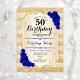 50º Convite de Aniversário. Design elegante em ouro e azul real. Apresenta fitas de ouro com brilho sutil, fonte de script na moda e confetti rosa de de safira. Perfeito para uma festa de aniversário de vidro.