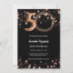 Um convite para fotos moderno e na moda para uma festa de aniversário 50ª. Um fundo preto, texto rosa dourado. Decorado com estrelas rosa douradas. Personalize e adicione os detalhes da sua festa.