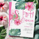 Convites de 50 anos bonitos apresentam um flamingo e botânicos cor-de-rosa-d-água. As palavras "Cinquenta e Fabuloso" são colocadas em letras divertidas. Uma escolha encantadora para um partido havaiano Luau. Solicite placas impressas ou convites de festas de aniversários imprimíveis. Para ver mais cinquenta modelos de convite de aniversário, visite www.zazzle.com/dotellabelle Arte e design de aquarelas únicas de Victoria Grigaliunas do Do Tell A Belle.