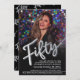 50 caracteres em negrito com efeito de estilo prateado, em cor prateada e preto. Personalize este 50º convite de aniversário de festa de aniversário com os seus próprios detalhes de evento de festa de aniversário e com as suas fotos de aniversariante ou rapaz. Outros anos, estão disponíveis uma versão em folha e itens correspondentes. © Original design por Sarah Trett para www.mylittleeden.com no Zazzle.