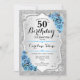 50º Convite de Aniversário. Design floral elegante em prata e azul gelado. Possui riscas prateadas com brilho inverso, fonte de script na moda e confetti rosa de de de turquesa. Perfeito para uma festa de aniversário de vidro.