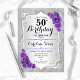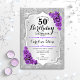 50º Convite de Aniversário. Design floral elegante em prata e roxo. Apresenta faixas de prata com brilho sujo, fontes de script na moda de rosa de de roxo e confetti. Perfeito para uma festa de aniversário de vidro.