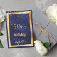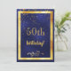 Uma carta de convite de aniversário festiva e elegante. Uma cor de fundo azul-da-meia-noite escura e uma imagem de ouro falsa. Com um ouro de chuva confete. A cor azul é irregular. Na frente do texto: 50º aniversário! e uma decoração floral falsa de ouro. Traseira: Modelos para informações de sua festa, cartas de ouro.