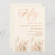 Um convite de 50 anos elegante. Um fundo creme, cor bege, decorado com flores silvestres de cor aquosa em verde bege, rosa, poeirento. Cinquenta é escrita com um grande estilo escrito à mão.