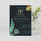 Comemore seu aniversário de 50 anos em estilo com este elegante design de folhas tropicais em verde e ouro em fundo azul-da-meia-noite. Adicione sua foto à parte traseira do convite usando a função de edição. Você também pode alterar a fonte, o tamanho da fonte e as cores da fonte.
