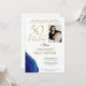 50 e Fabuloso convite para fotos de aniversário do 50º Ornament Dourado. 50 e texto fabuloso no script do ouro de tendências com foto e nome. O convite tem um ornamento de ouro e uma bela mármore azul. Personalize-o com sua foto e detalhes, e faça um convite de aniversário surpresa elegante para a festa de aniversário da mulher.