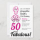 Convide seus amigos para uma festa 50 e Fabulosa! Celebre sua amiga especial com este desenho de uma senhora, com cabelo curto, em rosa e preto. Personalize seu nome, a data, o lugar e o RSVP. Concebido, ilustrado e protegido por copyright por ©Jacqueline Schneider.