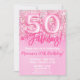 50 anos e Fabuloso Aniversário, Convite Rosa, 50º convite de aniversário para uma criança de 50 anos com escrevendo moderno de escrita e balões de folha divertida.
