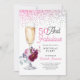 Uma na moda moderna 50 e fabulosa festa de aniversário com um vidro de champanhe floral, um borrão de brilho e uma tipografia rosa e preta da caligrafia.