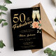 Moderno e falso roteiro de caligrafia em ouro 50 anos e fabuloso convite de aniversário preto com flautas de champanhe e rosas de pêssego rosa.