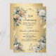 Um fundo com aspecto de ouro. Decorados com os florais brancos e amarelos e uma fita de ouro. Personalize e adicione um nome e detalhes.