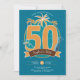 50º aniversário: um convite de aniversário náutico com o tema 50º, com o número 50 em letras grandes e ousadas, cercado por palmeiras, com uma garrafa de champanhe e um coquetel de champanhe. Esquema de cor azul e laranja. Um moderno, elegante 50º convite de aniversário para ele ou para ela.