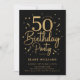 50th birthday party invitation in black and gold. Trendy modern design, perfect for a stylish men's or women's bday celebration. Features script font and confetti. Customize with your own details. Printed Zazzle invitations or instant download digital printable template.