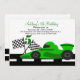 Comece a comemorar com este convite para corrida. Faça o 5 de aniversário daquele garoto especial um aniversário memorável! Este é um carro verde brilhante numa estrada. Ele tem duas bandeiras brancas e pretas acenando na frente do carro com um número 5 entre elas. Personalize-o com as informações da sua festa. Veja os muitos outros produtos e cores desta linha. Também para outras idades de aniversário. © Ilustrações JW