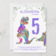 Celebre a garota que ama dinossauros fazendo 5 anos com este T-Rex cor rosa e roxo cor-de-rosa e um belo stegossauro convidando fãs Dino a uma festa de aniversário 5. Personalize este convite psicodélico e colorido Tyrannosaurus e stegossauro adicionando o nome da aniversariante, o número do aniversário e os detalhes da festa e você está preparado para um divertido e cheio aniversário de dinossauros roxos com tema dino. Todas as espécies de dinossauros são bem-vindas. Idade jurássica pré-histórica Ilustrações do dinossauro, obra de arte original de Catherine Sweetman