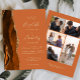 A borda esquerda deste elegante convite de casamento moderno apresenta uma laranja queimada e uma aquarela ferrugem borda agitada com falsa brilho de ouro. O texto personalizável combina ouro a letra manuscrita, placa de suporte e fontes itálicas em um fundo laranja queimado. O verso fornece espaços para 5 fotos (3 horizontais 1 quadrado e 1 vertical) e espaço para o seu site de casamento URL ou outra mensagem breve.