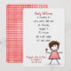 Garota bonita com vinho tinto em vidro, cabelo e vestido de gingham em fundo branco macio para a 60ª festa de aniversário. O texto pode ser editado.