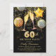 Um dinâmico convite de aniversário ousado 60º com óculos de champanhe, balões e confete dourado, ouro a preto. Folha de ouro falsa na parte de trás do convite.