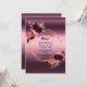 Na frente: Um convite para uma 60ª festa de aniversário. Um fundo metálico falso, de cor púrpura escura, com aspecto fino, com uma estrutura geométrica dourada. Decorados com flores roxas escuras e burgueiras, rosas e penas do estilo "boho". Modelos para um nome e detalhes da festa. O nome é escrito com um script de estilo manuscrito, letras pretas. Traseira: Fundo de aparência metálica falsa, de cor púrpura