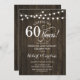 Convite de Celebração do 60º Aniversário de Casamento. Design rústico com padrão de madeira marrom escuro e luzes de fada. Apresenta fonte elegante e sofisticada. Parabéns pelos 60 anos! Pode ser personalizado para qualquer ano de casamento! Mensagem para mim se precisar de mais personalização. Convites Zazzle impressos ou modelo digital para download instantâneo. Perfeito para uma celebração de diamante de 60 anos de casamento com estilo.