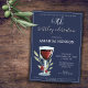 60.º aniversário do Marinho de vinho tinto Convite de festas azul. 60º convite de aniversário para ela ou para ele. Convite com um copo de vinho tinto, rosas e galhos num fundo azul marinho. O texto está em branco e é totalmente personalizável - personalize-o com seu nome, qualquer idade - 30 40º 50º 80 de 70 100º, data, localização e RSVP.