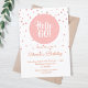 Um convite de festas elegante e glamouroso para uma 60ª festa de aniversário para uma mulher. Um fundo branco chic. Um grande círculo vicioso de cor rosa dourada esfrega-se com texto moderno de estilo escrito à mão: Olá 60! Rosa dourado, brilho de confete como decoração. Modelos para informações sobre a sua parte. Letras coloridas com ouro.