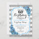 60º Convite de Aniversário. Design elegante em azul-azul-azul-azul-claro-brilhante, branco e azul-aqua-turquesa. Possui forte de script de na moda, listras e rosas azuis. Perfeito para uma bolsa mensageifesta de aniversario elegante. Pode ser personalizado em qualquer idade.