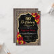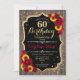60º Convite de Aniversário Rustic. Design elegante com ouro brilhante falso e padrão de madeira castanha escura. Possui girassóis e rosas. Perfeito para uma elegante festa de aniversário de campo ou jardim.