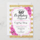 60º Convite de Aniversário. Design cor-de-rosa azul esbranquiçada de ouro elegante com brilho sujo. listras Douradas e brancas com rosas rosa. Perfeito para uma elegante sessenta festa de aniversário.