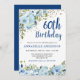 60º Aniversário Marinho Azul Script Floral Floral Watercolor Confetti Glitter Dots Invitation O design apresenta belos florais azuis claros e verdes.