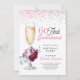 Um na moda moderno 60 e festa de aniversário sensacional com um vidro de champanhe floral, um borrão de brilho, e tipografia rosa e preta da caligrafia.