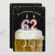 Número 62 velas de aniversário em caneca de cerveja com confete colorido em preto para convite para a 62ª festa de aniversário.