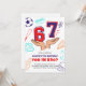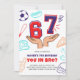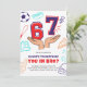 Score a touchdown with this sporty and fun 7th birthday invitation! Featuring a vibrant red and blue color scheme, this design showcases playful sports icons like a soccer ball, baseball bat, foam finger, and pizza, all surrounding the big '67' numbers. The bold text "YOU IN BRO?" adds a cool, energetic vibe perfect for a young boy's celebration. This invite is sure to get your guests excited for a birthday bash full of fun and games. Make his 7th birthday legendary with this awesome sports-themed invite!