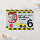 Convite de aniversário de 6 de construções com escopo de escavador e faixas de aviso amarelo e preto brilhantes. Perfeito para convidar os amigos favoritos do seu filho para a sua construção / construção de uma cesta de aniversário. Personalize com seus próprios detalhes de aniversário. Desenvolvido e ilustrado exclusivamente por Sarah Trett.