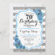 Convite de aniversário de 70. Design elegante em azul-azul-azul-azul-claro-brilhante, branco e azul-aqua-turquesa. Possui forte de script de na moda, listras e rosas azuis. Perfeito para uma bolsa mensageifesta de aniversario elegante. Pode ser personalizado em qualquer idade.