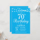 70 Aniversário com Luzes de Cordas. Fundo Azul. Homens ou Mulheres Aniversário. 13 15 16º 18º 20 21rua 30 40º 50º 60º 80 de 70 100º, qualquer idade. Para mais personalização, clique no botão "Personalizar" e use nossa ferramenta de design para modificar este modelo.