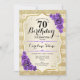 Convite de aniversário de 70. Design elegante em ouro e roxo. Apresenta faixas de ouro com brilho sutil, fontes de script na moda de rosa de de roxo e confetti. Perfeito para uma festa de aniversário de vidro.