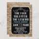 Um convite ousado de 70, com texto branco e azul sobre um fundo preto cercado de madeira. Por favor, anote as palavras "O Homem, O Mito, A Lenda" e todas as linhas ornamentais NÃO são editáveis.