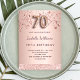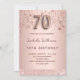Um convite moderno, na moda e glamouroso para uma festa de aniversário 70. Um fundo rosa dourado com rosa dourado e estrelas pingantes cor-de-rosa.O nome é escrito com um moderno roteiro de estilo colorido com letra de rosa escuro. Personalize e adicione os detalhes da sua festa. O número 70 é escrito com uma fonte de estilo de balão, script.
