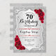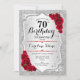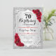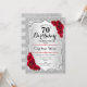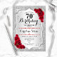 Convite de aniversário de 70. Design floral elegante em prata e vermelho. Apresenta faixas de prata com brilho inverso, fonte de script do rosa vermelha na moda e confetti. Perfeito para uma festa de aniversário de vidro.