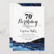 convite de aniversário 70 azul, branco e dourado agate. Elegante design moderno com cor azul-real de água agate marble geode fundo, fonte falsa de ouro brilhante e script de tipografia. Trendy convida o cartão perfeito para uma comemoração de dia das mulheres na moda. Impressos convites Zazzle ou modelo de impressão digital instantânea para download.