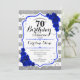 Convite de aniversário de 70. Design elegante em prata brilhante, branco e azul real. Possui forte de script de na moda, listras e rosas azuis. Perfeito para uma bolsa mensageifesta de aniversario elegante. Pode ser personalizado em qualquer idade.