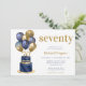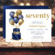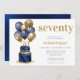 Este fabuloso convite de aniversário de 70 para homens com 2 camadas de azul e bolo de ouro com marinho azul e balões de ouro, o número 70 em ouro e confete azul brilhante seria perfeito para celebrar seu marido, irmão, pai, amigo, colega de trabalho. É tradicional e clássico enquanto é fresco, moderno e contemporâneo. A parte de trás é uma folha azul-marinho coordenadora.